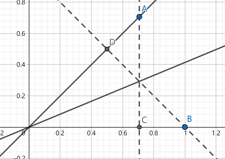 可以发现,经过对称,$x$轴在$\vec e$上的投影长度恰好等于$\vec e$在$x$上的投影。所以,新空间的基可以解释为原空间基在$\vec e$上的投影长度。因此新空间所有点在原空间内均对应着在$\vec e$所确定的直线上的投影。再回来看公式的另一个变形